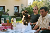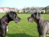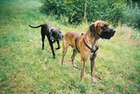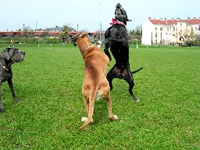 Atzgersdorf Mai 2004 Ich hatte noch keinen eigenen Internet Zugang und so war ich immer froh, wenn ich auf Besuch bei meinen Eltern war und bei den Nachbarn zum PC konnte. Die Doggen-Seiten waren immer das Ziel des Suchens und so gelang ich oh Wunder, irgendwie auf die Seite von Christine. Und siehe da, ich las da etwas über ein Doggentreffen. Mit viel Mühe und Not, gelang es mir eine E-Mail zu verschicken, wo ich meine Telefonnummer bekannt gab. Christine rieg mich auch kurze Zeit darauf zurück. Voll Freude verabredeten wir uns für Donnerstag mit dem Hinweis ich möge doch vorher anrufen, damit sie ihren Hund Purzel darauf vorbereiten kann und es zu keinen Problemen kommt. Endlich war es Donnerstag und ich machte mich mit Rocky auf den Weg zu Christine. Sie hatte mir den Weg ganz toll beschrieben, sodass wir ich pünktlichst in die Steinergasse bog. Ich rief an und oh Schreck: Christine war ganz verwundert, was ich denn da jetzt will. Naja sagte ich, ich komme doch zum Doggentreffen. Nach einer kurzen Funkstille am Telefon meinte Christine jedoch, dass das Doggentreffen erst nächste Woche stattfinden würde! Oh Gott, typisch für mich - auf das Datum hatte ich nicht geachtet. Was soll's meinte Christine, wenn ich schon da bin, dann sollen wir doch nur mal rein kommen. Mit einem hoch roten Gesicht stieg ich und Rocky aus dem Wagen - am liebsten wäre ich im Erdboden versunken. Doch Christine stad mit einem freundlichen Gesicht da und hieß mich auf das herzlichste willkommen. Sie war mir auf Anhieb sympathisch und alle Bedenken waren wie weggefegt! Dann kam noch Rocky und die Sache war geritzt! Jetzt kam der schwierigste Teil, nämlich Purzel mit Rocky zusammen zu bringen. Ich hatte wirklich bedenken und die Hose gestrichen voll, denn ich wußte nicht so recht wie Rocky sich verhalten würde. Aber was passierte? Meiiiiiin Hund lag am Boden alle Viere von sich gestreckt, rosa Ohren und Purzel über ihn. Ich war richtig paff- Von da an war klar, wer der Herr im Hause ist, Purzel der Herrscher über Haus und Sportplatz.