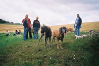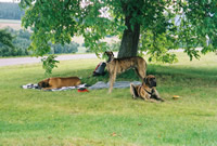 Während die Hunde den Fußballplatz unsicher machten, erzählte besser gesagt klärte mich Christine auf und erzählte mir von dem Doggentreffen. Also war es gar nicht so schlecht, daß wir uns schon vorher getroffen hatten. Denn die Woche darauf kam ich und Rocky schon wie alte Freunde auf den Platz und Purzel und Rocky verstanden sich prima. Es war ein toller Tag, denn wir hatten soviele schöne und liebe Doggis noch nie gesehen geschweige denn kennen lernen dürfen. Na ja und über Frauchen und Herrchen brauch erst gar nichts zu sagen. |
